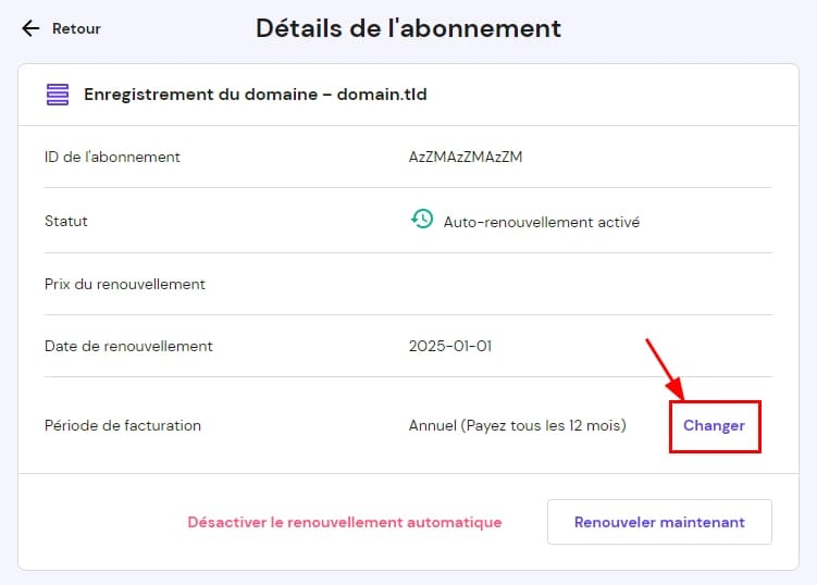 Si une facture de renouvellement a déjà été émise pour ce service, veuillez couvrir ce paiement au préalable pour activer l’option de modification du cycle de facturation.
