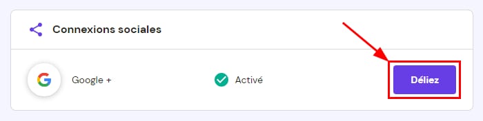 Sur la page Informations sur le compte, vous trouverez la section Connexions sociales , où votre méthode de connexion actuelle sera affichée. Cliquez sur Déliez :