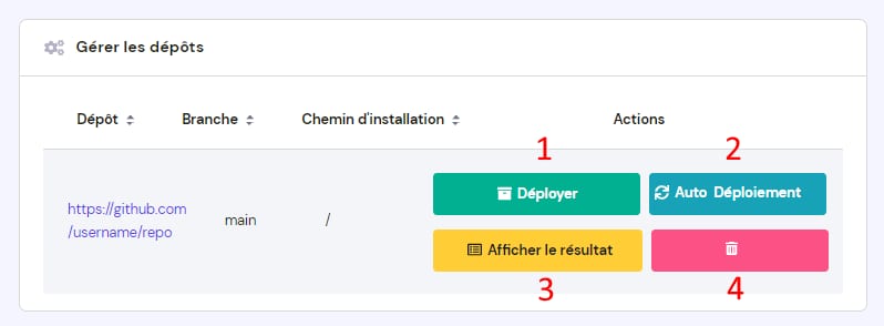 Dans le champ Créer un nouveau dépôt, vous pouvez configurer vos paramètres de déploiement :
