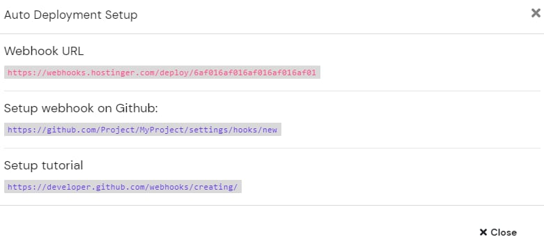 Vous pouvez utiliser l’URL du Webhook pour le déploiement automatique afin de fusionner une branche Git sélectionnée. Vous recevrez une URL de Webhook une fois que vous aurez cliqué sur le bouton Déploiement automatique.