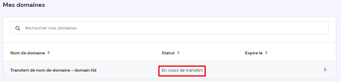 Le transfert du nom de domaine est en cours. Vous pouvez vérifier des informations supplémentaires en cliquant sur votre nom de domaine, où vous verrez s’il y a des notes supplémentaires concernant ce statut.