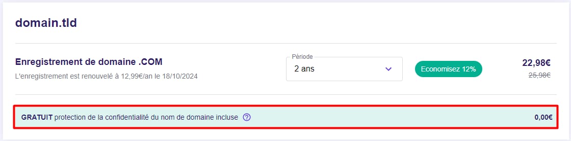 Si vous allez commander un nouveau domaine, vous pouvez vérifier que la protection de la vie privée est ajoutée gratuitement dans le panier avant de poursuivre la commande :