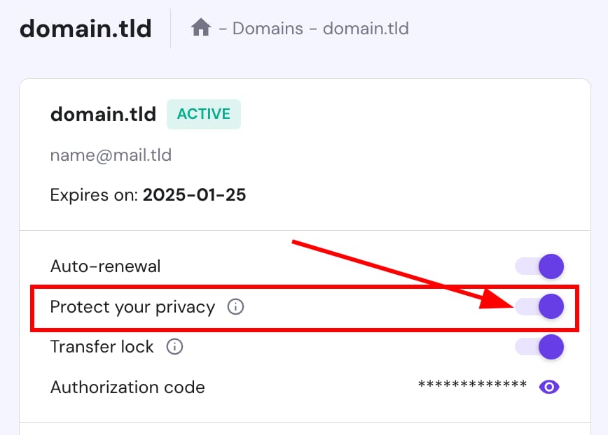 Vous pouvez faire passer votre protection de la vie privée au niveau supérieur en optant pour la protection de la vie privée WHOIS, afin que toutes vos coordonnées soient masquées et sécurisées. Et le meilleur, c’est que cette protection est incluse gratuitement dans l’achat de votre nom de domaine chez Hostinger pour tous les TLD pris en charge !