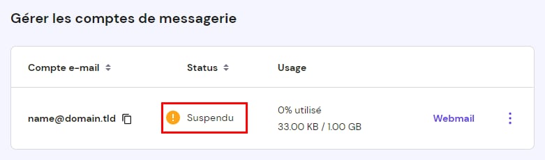 Si vos services de messagerie ont été désactivés automatiquement et/ou votre compte de messagerie apparaît comme Suspendu :
