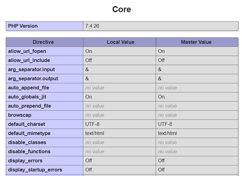 Là, vous pourrez voir la configuration PHP actuelle de votre site web, qui inclut les éléments suivants :