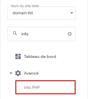 Les informations et paramètres PHP, appliqués à votre hébergement, peuvent être vérifiés à tout moment en accedant Sites web → Gérer, en recherchant item dans la barre latérale de gauche et en cliquant dessus :