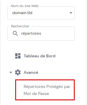 Vous pouvez accéder à cette fonctionnalité en ouvrant Sites Web → Gérer, puis en recherchant Répertoires protégés par mot de passe dans la barre latérale gauche et en cliquant dessus :