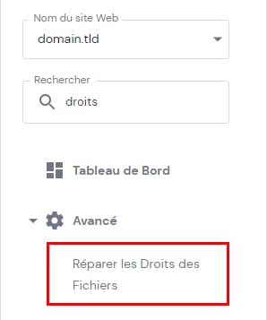 Vous pouvez le trouver dans la section Sites web → Gérer, recherchez Réparer les droits des fichiers dans la barre latérale de gauche et cliquez dessus :