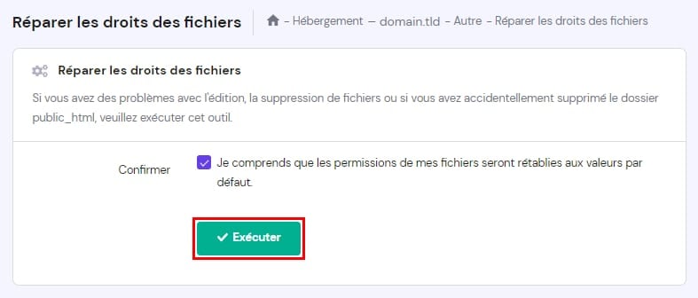 Cochez l’option pour confirmer que vous souhaitez définir les fichiers et dossiers sur les droits par défaut et cliquez sur Exécuter :