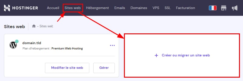 Pour héberger plusieurs sites web, allez dans la section Sites web de votre panneau et cliquez sur Créer ou migrer un site web :