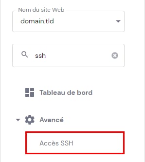 Pour activer l’accès SSH à votre compte, ouvrez Sites web → Gérer, recherchez Accès SSH dans la barre latérale et cliquez dessus :
