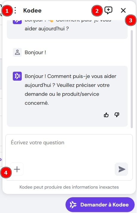 Fermer la fenêtre de discussion : utile si vous avez besoin d’accéder à quelque chose derrière la conversation. Cliquez à nouveau sur « Demander à Kodee » pour reprendre votre discussion.