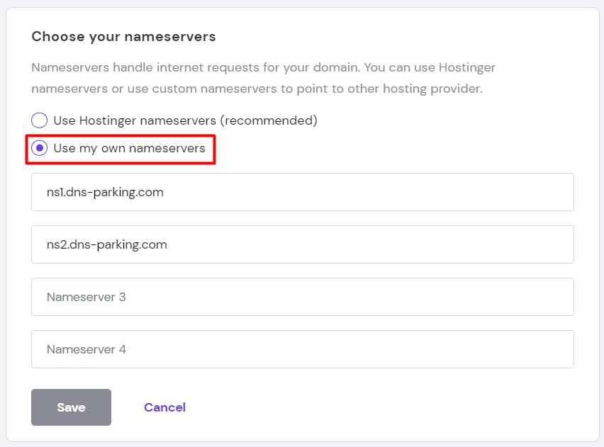 Vous pouvez changer les enregistrements NS en naviguant dans la section Choisissez vos serveurs de noms. Si vous souhaitez que votre domaine pointe vers Hostinger via les serveurs de noms, il vous suffit de choisir Utiliser les serveurs de noms Hostinger (recommandé) :