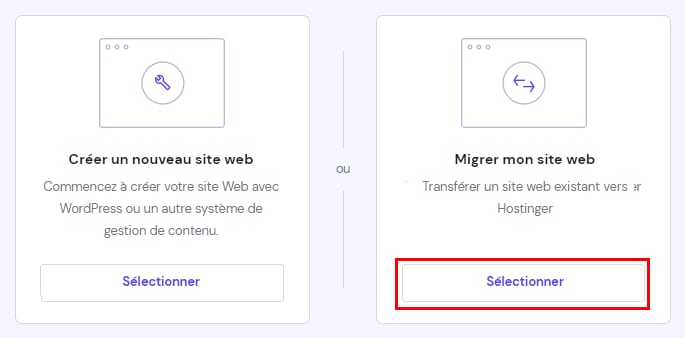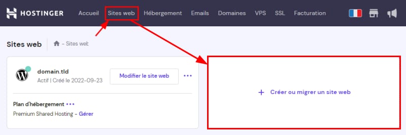 Alternativement, vous pouvez créer une demande de migration et notre équipe se chargera de migrer le site web pour vous. Pour migrer un site, allez dans Sites web et cliquez sur Créer ou migrer un site internet :