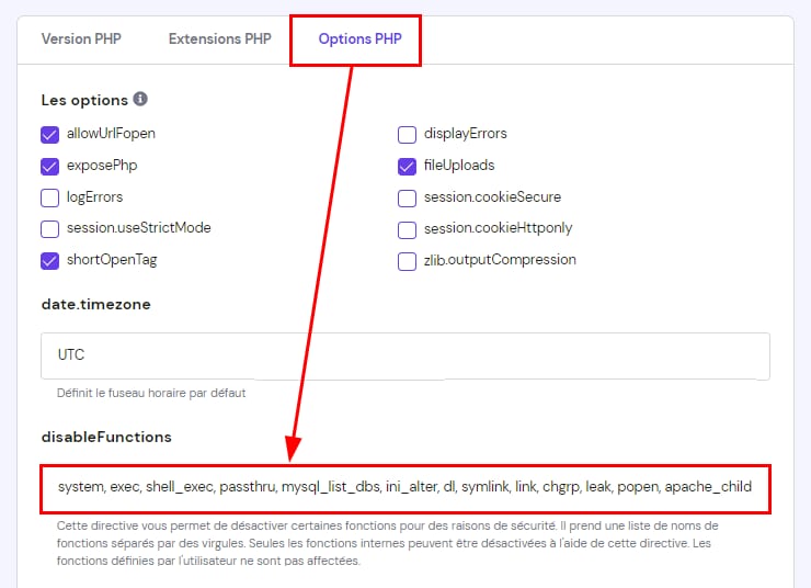 Ouvrez l’onglet des options PHP, et faites défiler jusqu’à la section disableFunctions :