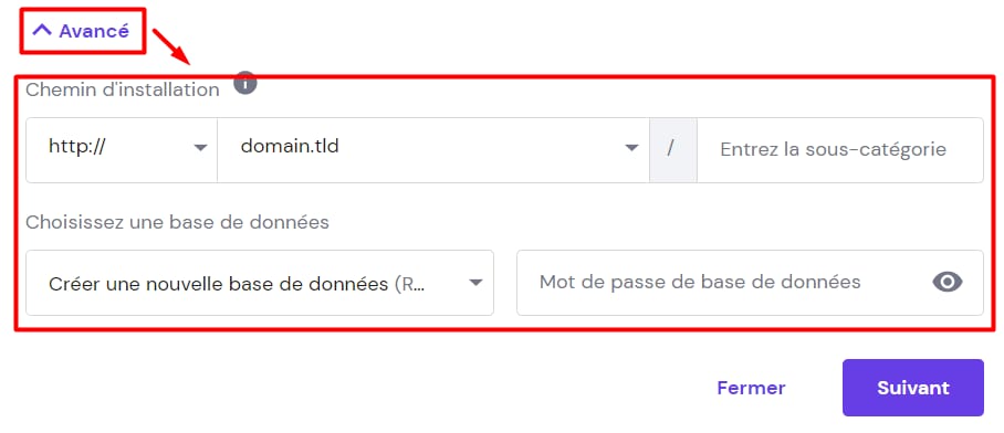 Si vous voulez spécifier un sous-répertoire personnalisé ou utiliser une base de données existante, choisissez Avancé et remplissez les détails :