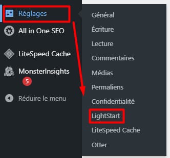 Après l’activation, configurez les paramètres de l’extension et activez-la. Pour ce faire, rendez-vous dans votre barre de menu à gauche et choisissez Réglages→ LightStart :