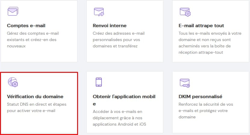 Tous les réglages sont faits ! Une fois ces changements propagés (jusqu’à 24 heures), accédez à Emails → nom de domaine → Vérification du domaine :