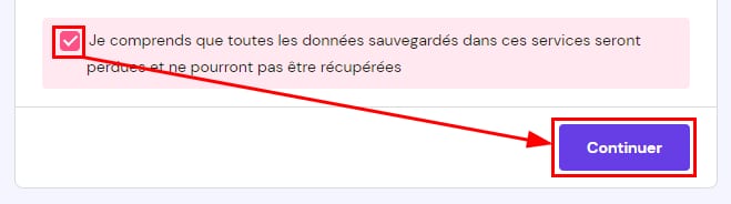 Vous recevrez des informations concernant vos services avant l’annulation. Après les avoir lues, cochez la case de vérification et cliquez sur Continuer :