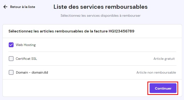 Ensuite, vous verrez la liste des éléments de la facture. Sélectionnez les services que vous souhaitez rembourser et cliquez sur Continuer :