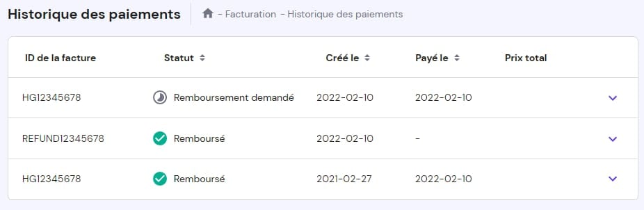 C’est fait ! Votre demande de remboursement a été enregistrée. Vous recevrez un mail de confirmation. Vous pourrez également suivre son évolution via la section Facturation → Historique des paiements :