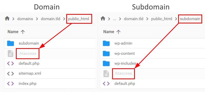 Ensuite, accédez au dossier auquel vous souhaitez appliquer une version différente de PHP. Si vous voulez modifier un nom de domaine, accédez à son dossier public_html. Pour un sous-domaine, le dossier correspondant se trouvera dans le dossier public_html du nom de domaine :