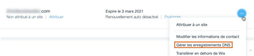 Si votre domaine est enregistré chez Wix, vous pouvez accéder à votre zone DNS à partir de la page de votre domaine en cliquant sur l’icône Afficher plus et en sélectionnant Gérer les enregistrements DNS :