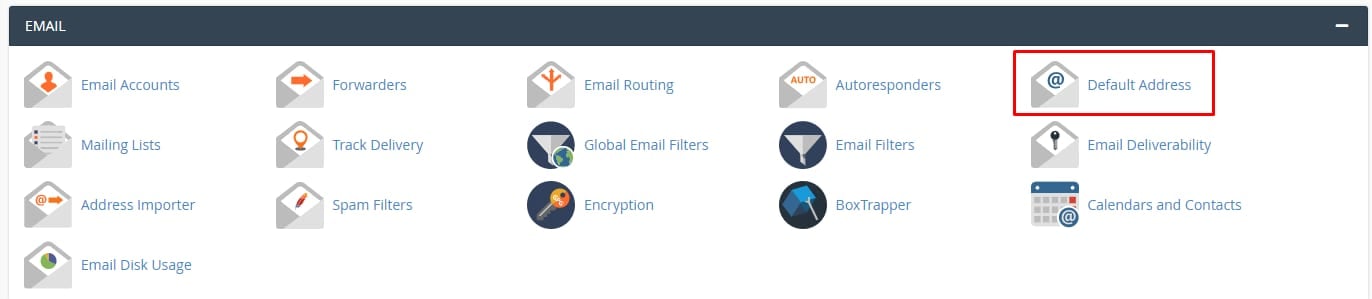 Pour commencer à récupérer tous les e-mails envoyés à votre domaine, accédez à votre cPanel et localisez le menu Adresse par défaut.