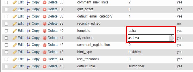 Dans phpMyAdmin, ouvrez la table wp_options et trouvez les lignes de modèle (template) et de feuille de style (stylesheet) – vous devrez peut-être faire défiler la page ou passer à la page suivante. Ces lignes contiennent le nom de votre thème actuel :