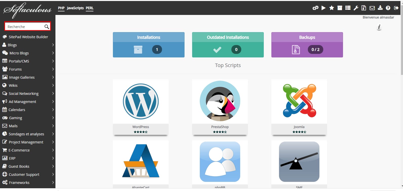 Une fois que vous êtes dans Softaculous, vous pouvez choisir parmi une variété d’applications en choisissant différentes catégories ainsi que trouver celles que vous désirez dans la section Recherche :