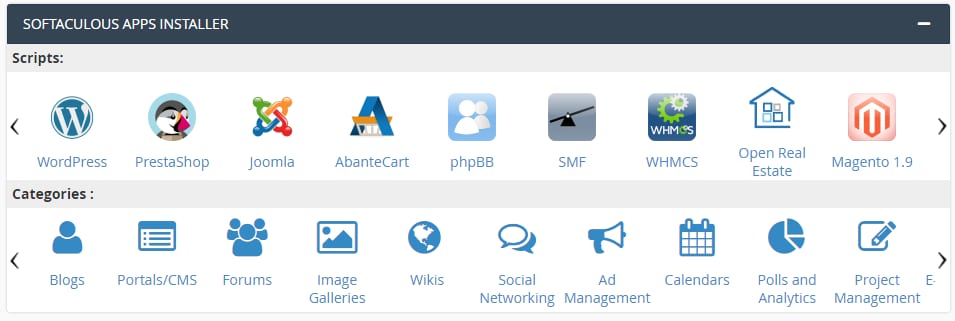 Vous pouvez facilement installer des applications automatiquement à l’aide de notre installateur d’applications Sotfaculous. Cette fonction vous permet d’installer automatiquement n’importe quel CMS disponible sur votre compte cPanel, par exemple, WordPress, Joomla, Drupal, et bien d’autres 😊