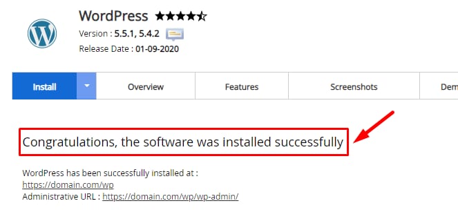 Une fois que les informations requises et tous les détails sont remplis, cliquez sur Installer en bas de la page. Softaculous fera le reste pour vous ! Vous verrez un message de confirmation dès que l’installation sera terminée :