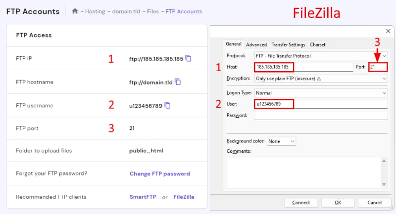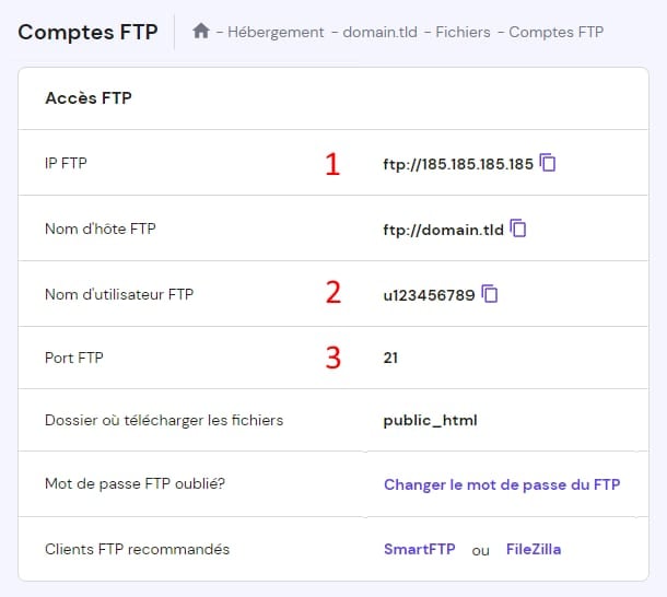 Vous pouvez également trouver un guide détaillé sur la façon d’obtenir les informations FTP ici : Comment trouver les détails FTP sur hPanel . Si vous avez oublié votre mot de passe FTP, vous pouvez le changer en suivant ces étapes : Comment changer votre mot de passe FTP sur hPanel.