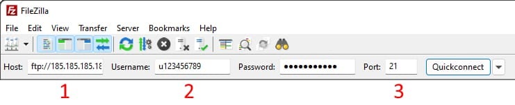 Ouvrez FileZilla et remplissez la section Quickonnect avec les détails FTP que vous avez obtenus dans la section Comptes FTP :