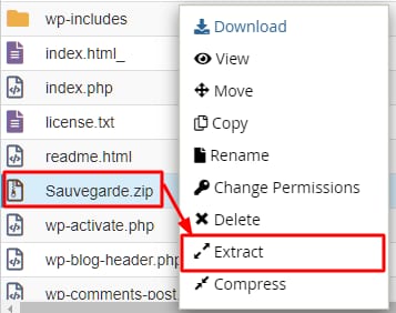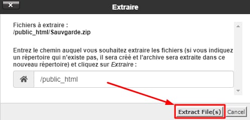 Enfin, sélectionnez le répertoire d’extraction (dans cet exemple, les fichiers ont été extraits dans le répertoire public_html).