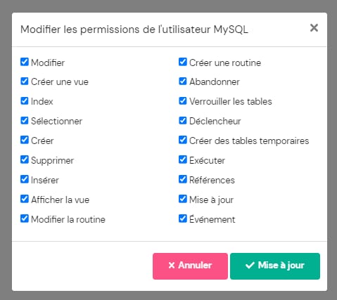 Par défaut, l’utilisateur de MySQL a toutes les permissions accordées. Vous pouvez révoquer les permissions en supprimant la coche à côté de la permission spécifique :
