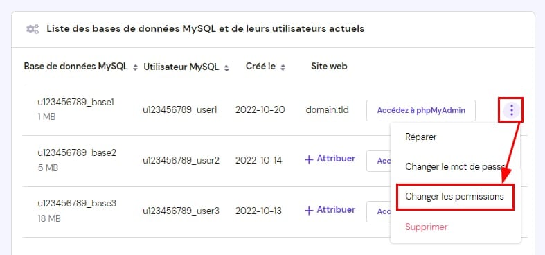 Dans la section Liste des bases de données et leurs utilisateurs MySQL actuels, cliquez sur le bouton ⋮ en face de la base de données souhaitée et choisissez Changer les permissions :