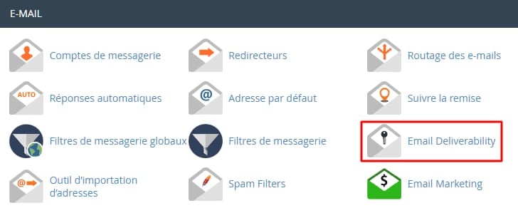 Vous pouvez facilement activer l’enregistrement SPF sur cPanel en allant à la section Email Deliverability, située dans la section E-MAIL: