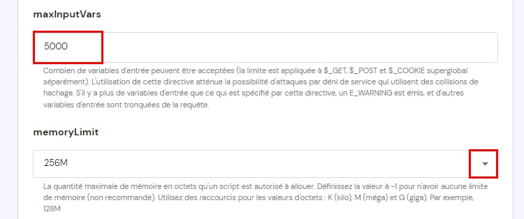 Vous ne pouvez définir que des valeurs égales ou inférieures à la limite de votre plan d’hébergement. Si vous définissez une valeur supérieure, la valeur maximale de votre plan d’hébergement sera appliquée.