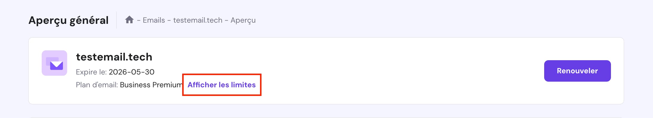 Vous trouverez le nom de votre plan email et les informations de base. Pour en savoir plus, cliquez sur Afficher les limites :