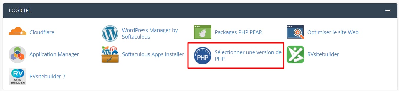 Les extensions PHP de votre compte d’hébergement peuvent être gérées à tout moment. Pour ce faire, il suffit d’accéder à votre cPanel → Section Logiciels → Sélectionner une version de PHP :
