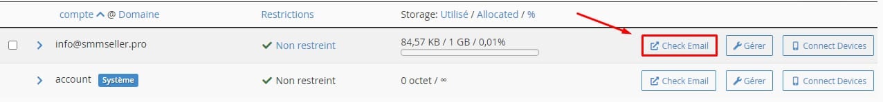 Sélectionnez le compte e-mail que vous souhaitez gérer et cliquez sur Vérifier l’e – mail :