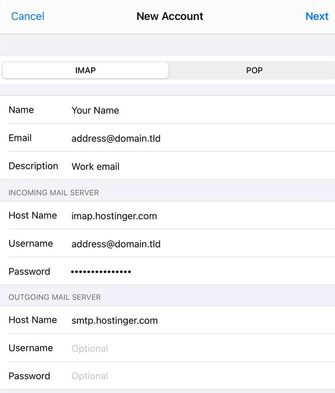 Hôte : imap.hostinger.com Cryptage : SSL Numéro de port : 993 |