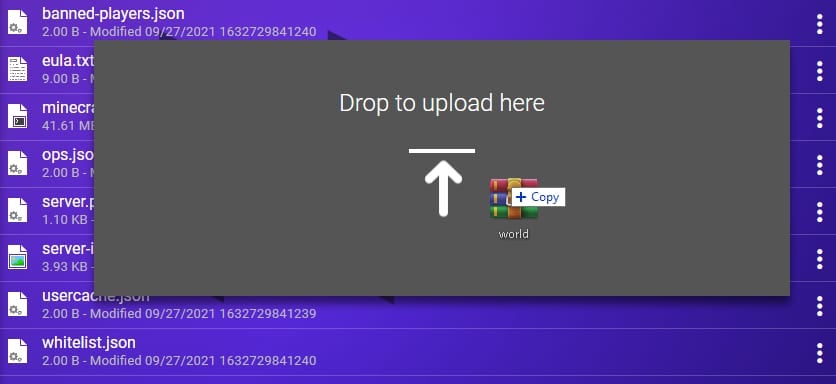Une fois que c’est fait, faites glisser le fichier archivé/compressé de votre monde depuis votre bureau vers la fenêtre du gestionnaire de fichiers :