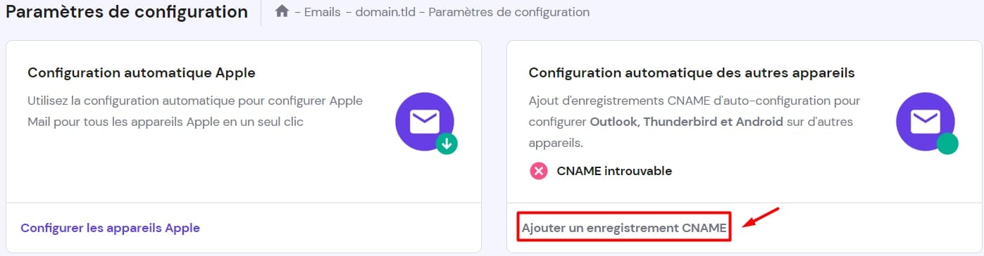 Si vous utilisez Outlook ou Mozilla Thunderbird pour Android ou Windows, il vous suffit d’ouvrir la page Emails → nom de domaine → Paramètres de configuration. Si votre domaine pointe vers les serveurs de noms Hostinger, cliquez simplement sur Ajouter un enregistrement CNAME :