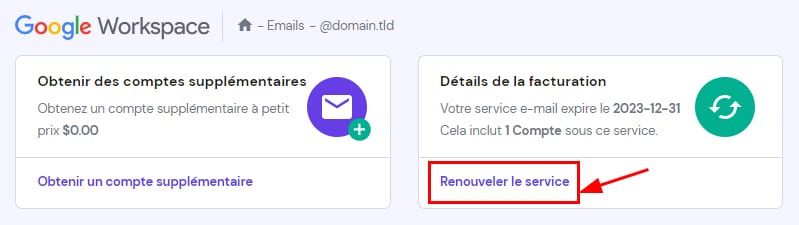 Votre plan de messagerie Google Workspace peut être facilement renouvelé à tout moment en ouvrant la section Emails, en sélectionnant Gérer :