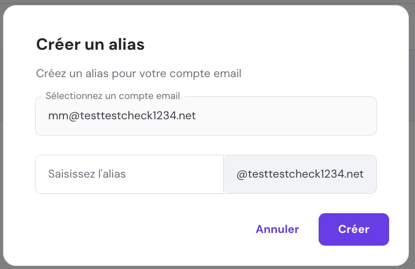 Saisissez l’alias pour votre compte email, puis cliquez sur « Créer ».