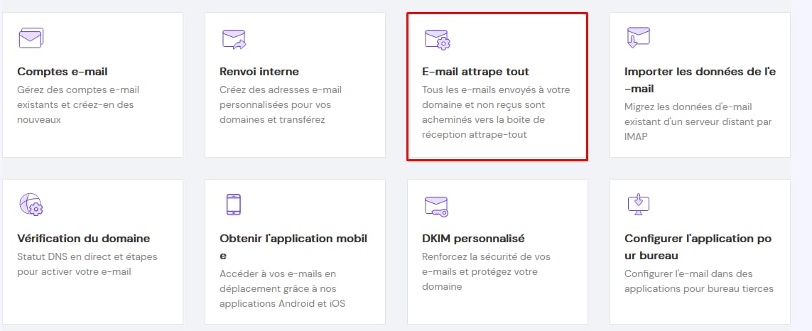 Pour commencer à capter tous les emails qui sont envoyés à votre nom de domaine, ouvrez votre page Emails → nom de domaine, puis cliquez sur E-mail attrape tout :