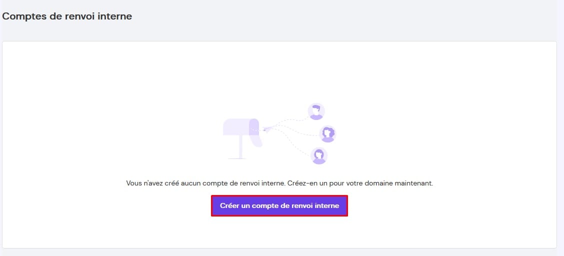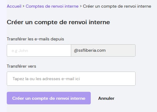 Il vous suffit de spécifier l’adresse depuis et de sélectionner l’une de vos boîtes aux lettres existantes pour la redirection vers. Une fois que tout est fait, cliquez simplement sur Créer un compte de renvoi interne.