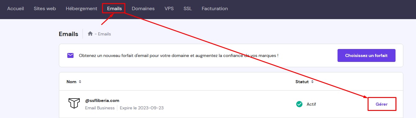 Les redirections internes sont un excellent moyen de transférer les emails d’une adresse email particulière vers une autre boîte email existante. Avec Titan Email, vous pouvez les créer en ouvrant la section Emails et en sélectionnant votre domaine :